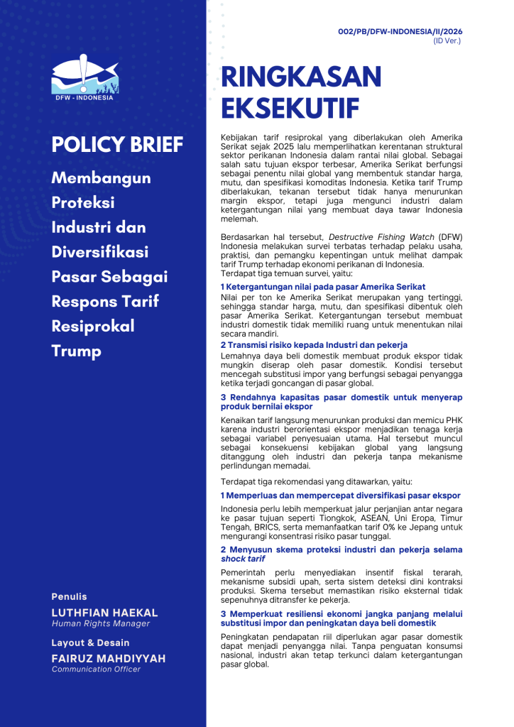 Tarif resiprokal 10% yang diberlakukan Amerika Serikat pada April 2025 lalu memberikan tekanan signifikan terhadap sektor perikanan Indonesia. Sejumlah perusahaan pengolahan tuna loin yang berorientasi ekspor ke pasar Amerika Serikat menghentikan produksinya. Mengingat Amerika Serikat merupakan tujuan utama ekspor perikanan dengan nilai FOB paling tinggi, kebijakan tarif resiprokal berimplikasi terhadap ekonomi perikanan nasional. Oleh karenanya, DFW Indonesia melaksanakan survei terbatas pada 22 Juli-6 Agustus 2025 untuk mengidentifikasi dampak tarif terhadap sektor perikanan Indonesia.