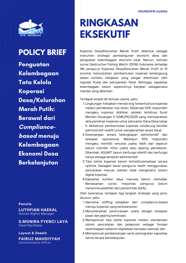 Koperasi Desa/Kelurahan Merah Putih merupakan program turunan dari Asta Cita ke-6 yang menekankan pembangunan dari desa dan dari bawah sebagai strategi pemerataan ekonomi dan pengentasan kemiskinan. Dalam konteks pembangunan dari desa dan dari bawah, pada September 2025 Kementerian Kelautan dan Perikanan (KKP) menetapkan Koperasi Desa/Kelurahan Merah Putih sebagai pengelola unit-unit usaha perikanan di setiap lokasi Kampung Nelayan Merah Putih (KNMP). Berikut policy brief atas hasil temuan kami dari survey Koperasi Desa/Kelurahan Merah Putih disini.